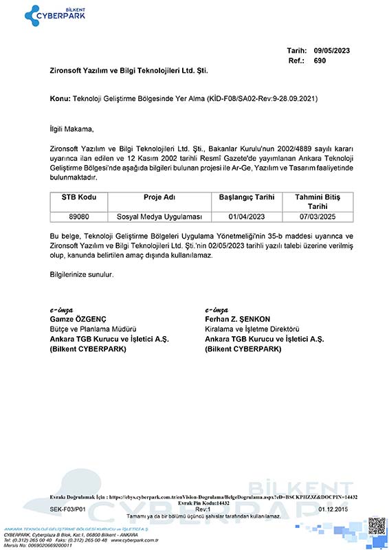Zironsoft is a software startup company founded in 2022 and currently operating at Bilkent CyberPark Ankara Technology Bridge. We produce customer-specific solutions that digitalize business processes by using the most up-to-date software technologies and agile software development principles for institutions and organizations that want to keep up with this rapid change trend in the digitalizing world, and companies operating in the manufacturing and service sectors.